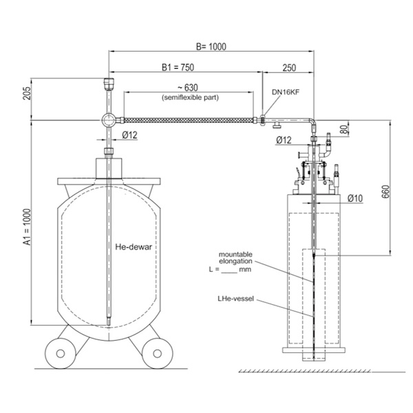 主要用來從大型液氦杜瓦瓶傳輸液氦至小型液氦杜瓦瓶,或者從用液氦杜瓦瓶為核磁做補(bǔ)液使用。根據(jù)客戶具體用途定制柔性管路和硬管具體長度。